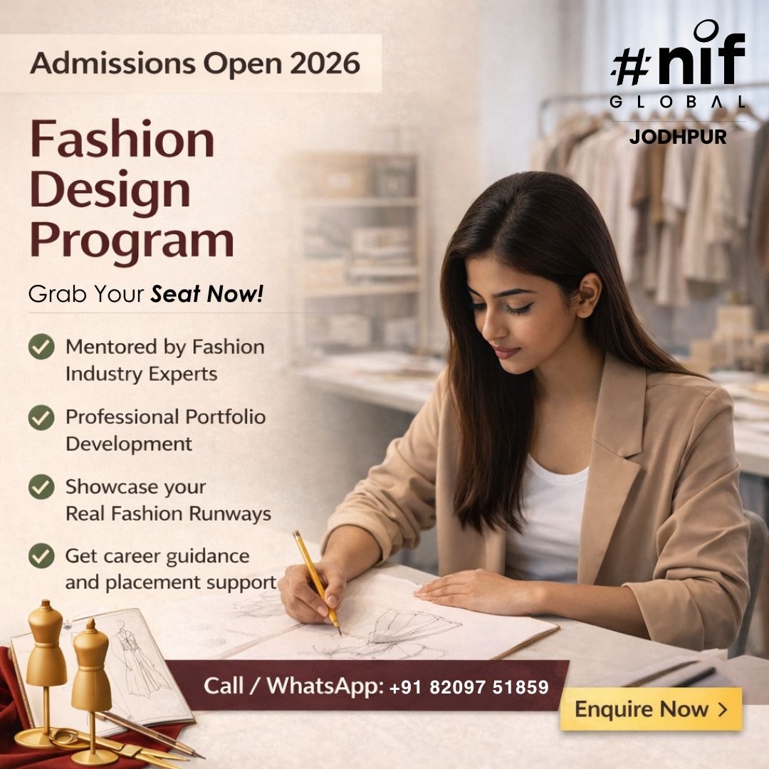 NIF Global Jodhpur is one of the leading institutes for fashion design and interior design courses in Jodhpur, Rajasthan. Located on Pal Road, Jodhpur, the institute offers professional programs including B.Des, B.Voc, M.voc, M.des, diploma, and advanced diploma courses in Interior Design and Fashion Design. Students receive practical training, industry exposure, portfolio development, and software training such as design visualization tools. The institute focuses on creativity, innovation, and career-ready skills to prepare students for opportunities in the fashion, interior, and lifestyle design industry. NIF Global Jodhpur provides expert faculty, modern studios, and hands-on learning to help students succeed.